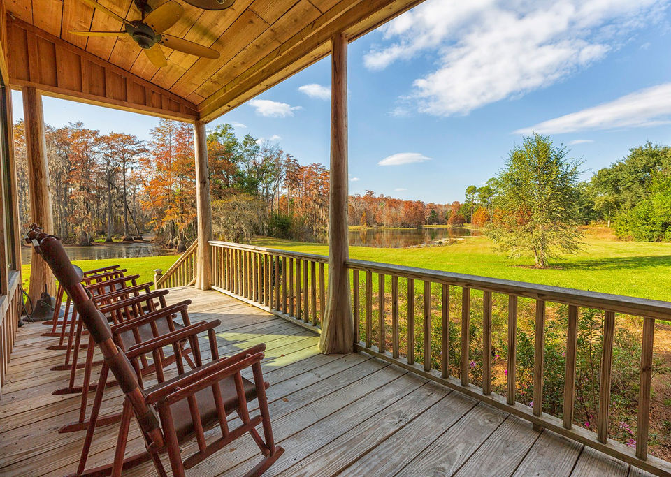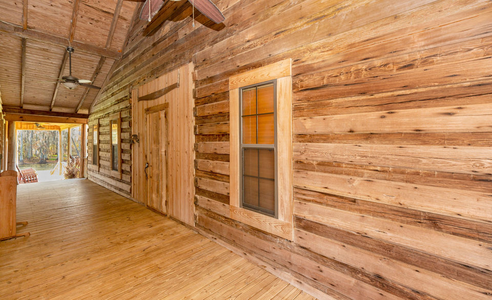 Since then, a 1840's log cabin was restored and attached to the main cabin with a covered porch. In 2015 a large extension was added which is pictured in the photo to the right which features an enlarged kitchen, king bedroom and bathroom, and large main living area featuring plate glass windows surrounding a huge indoor fireplace overlooking the beautiful Cypress’s of Sim’s Pond.